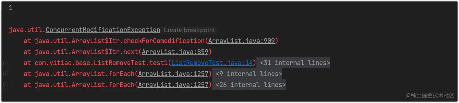 而expectedModCount是ArrayList的内部私有类Itr的属性,在调用next()方法时是没有+1操作的,自然和modCount就不会相等,异常就这么出来的。
