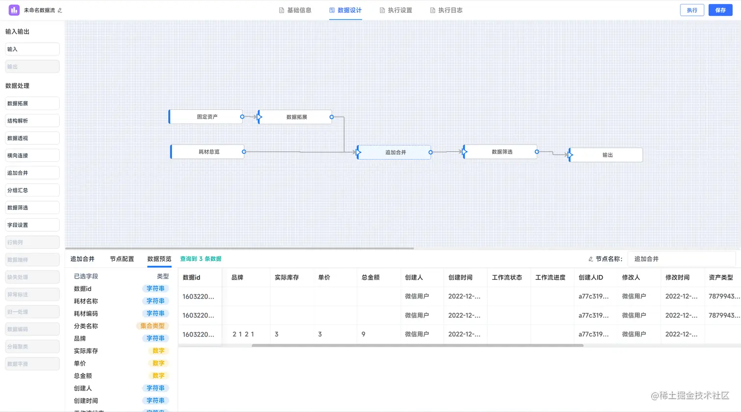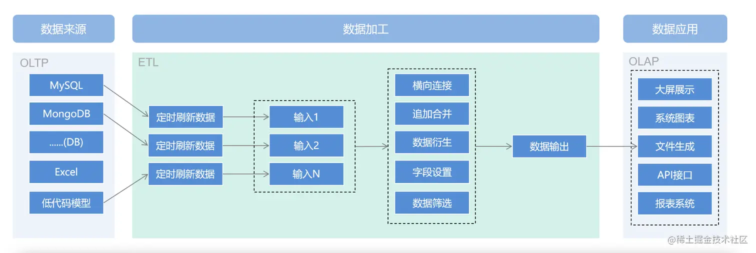 其实我们是不需要去做一些非常复杂的统计,因为有些行业已经在用这些数据进行业务分析了,我们只要按照自己的想法去加工即可,比如上面表中的这个问题中的数据,只需要,通过界面化的数据流程化的配置操作即可完成,支持数据 数据衍生、数据透视、多表关联、追加合并、数据过滤......
