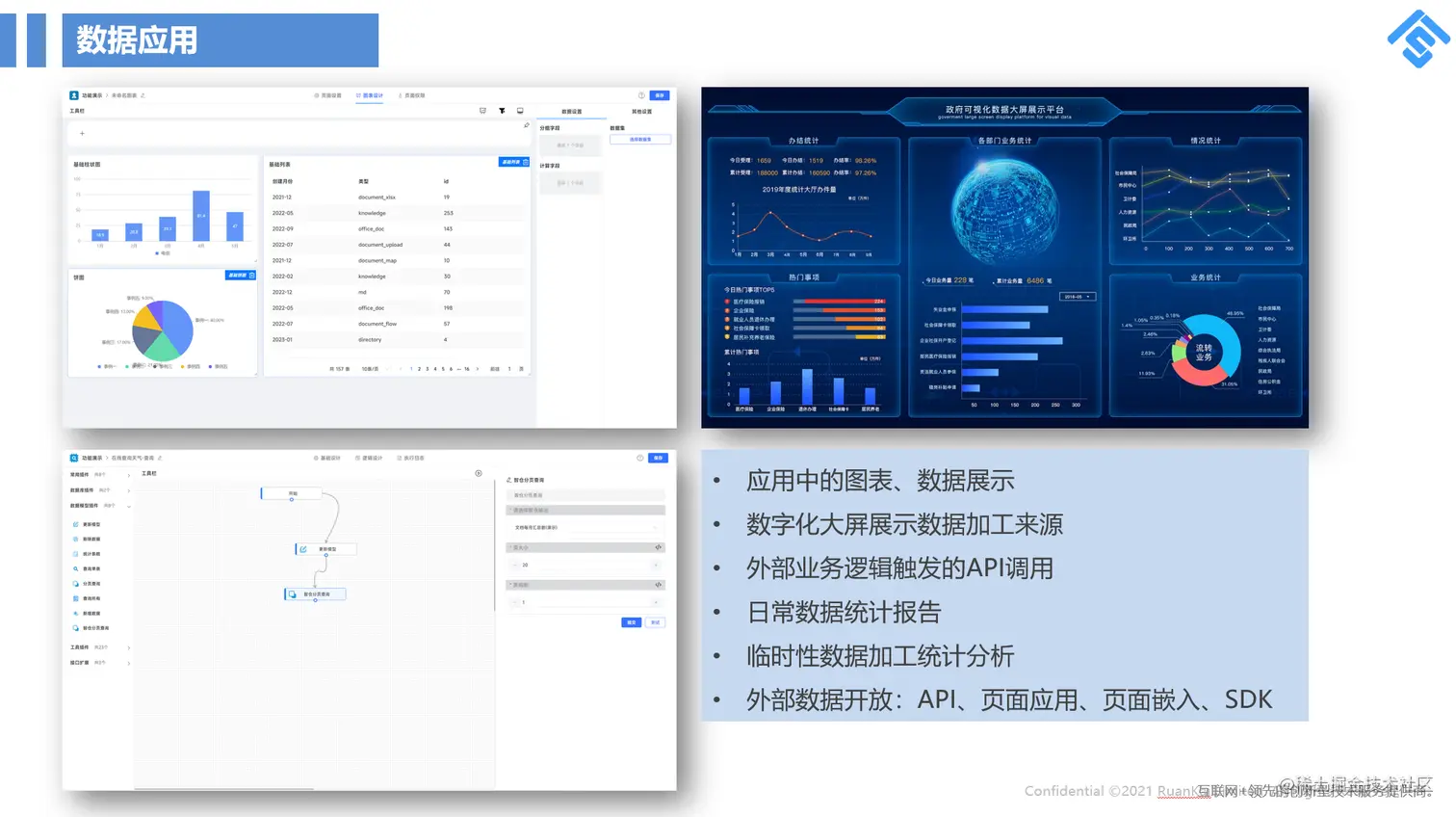 可以将数据纳入到低代码开发平台中去,完成轻应用的分析展示,也可以纳入到其他的业务系统中,对接调用,当然用户最广的就是数字大屏、分析报表等。