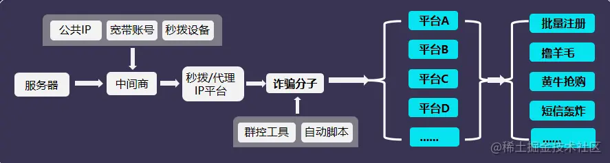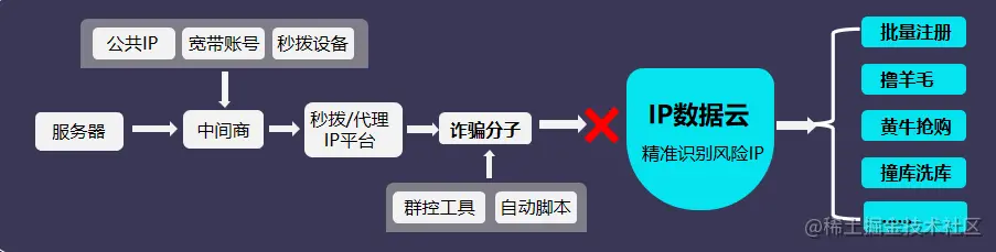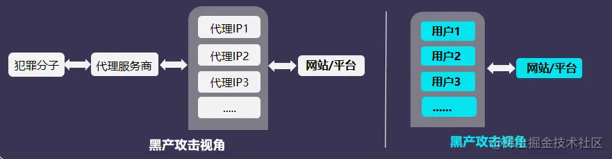 通俗地讲,代理IP就是网络信息的中转站,黑产可以用它来隐藏且伪造多个用户网络环境,平台只会知道有IP给自己发送了请求,但无法判断这些IP背后是正常用户还是代理服务商。