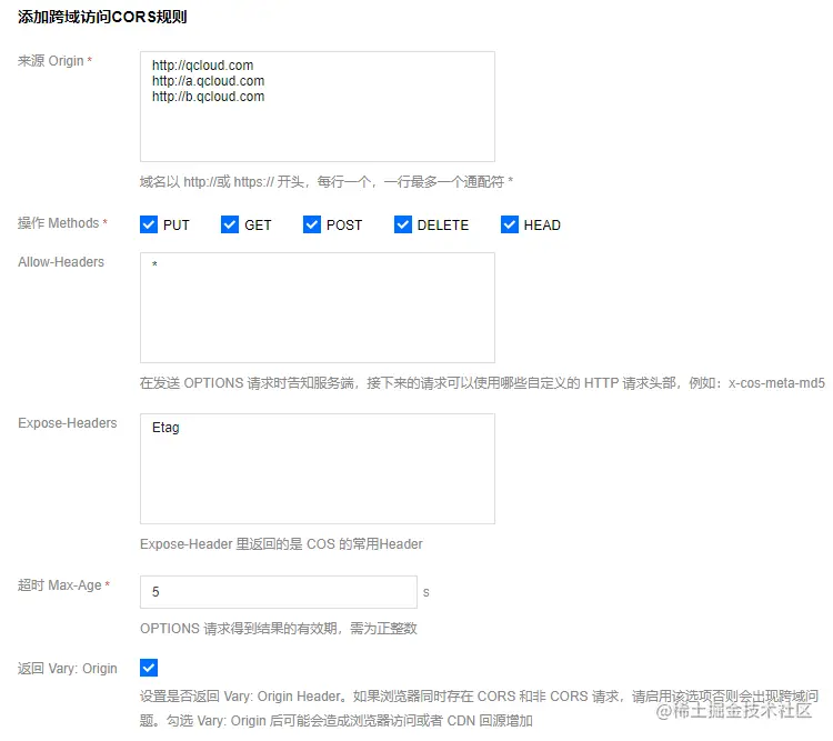 - 进入存储桶详情页,单击安全管理页签。下拉页面找到跨域访问CORS设置配置项,单击添加规则,配置示例如下图,详情请参见 设置跨域访问 文档。