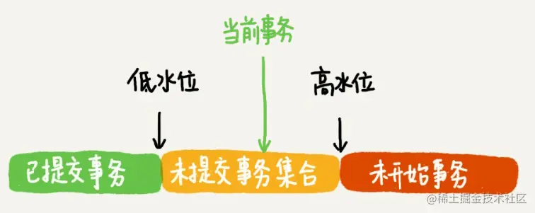 数组里面事务ID的最小值记为低水位,当前系统里面已经创建过的事务ID的最大值加1记为高水位。