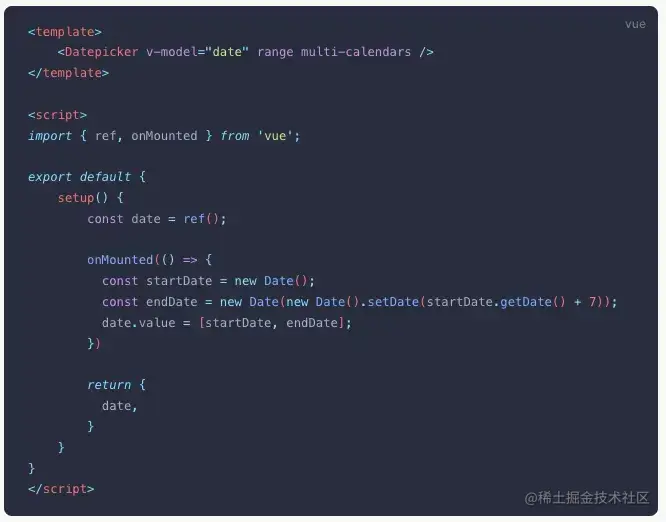 日期选取器的各列会按照指定的风格进行自动配置,这样就让开发者不必关心如何配置表盘这样的底层操作。 你也可以对其进行定制,令其使用任何范围的日期。它的风格简单,它包括许多功能,如多日期选择、范围日期选择器、多个日历、深色和浅色主题、SSR 支持等等,被包装在一个光滑和用户友好的UI中。它甚至支持i18n语言和日期格式的本地化。在组件或视图中导入,使其可以使用。