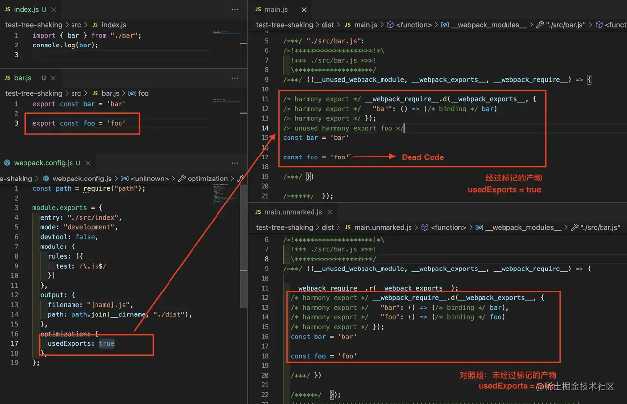 右上角就是经过标记删除后的打包代码,这时候const foo = 'foo'就变成了Dead Code,再经过Terser插件来消除Dead Code,tree-shaking功能才算完成