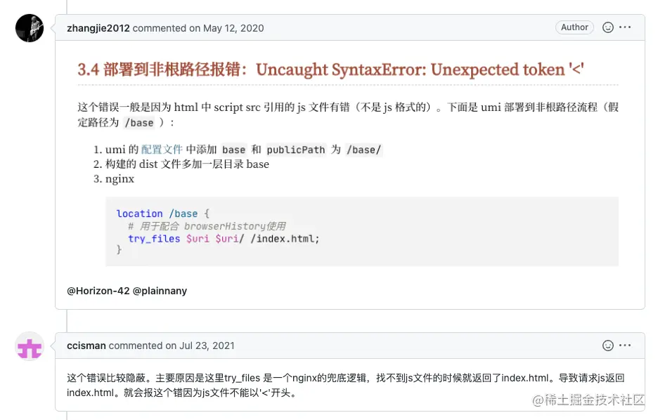 我们都知道现代脚手架构建的项目中,静态资源文件都会添加hash码来防止缓存,但是html是没有带hash码的,也就是说html是可能带来缓存问题的:当项目重新部署后,访问系统时浏览器可能还是上次访问的index.html,这就造成了这个html中加载的静态资源还是上次的(<Link>和<sciprt>标签中的资源),也就可能无法访问到(因为旧的静态资源已经被删除),在nginx中往往会有如下配置,找不到资源时就会返回index.html这个文件(这也Ngxin是防止找不到资源的一个兜底处理),一个JS文件返回的是html内容,这样浏览器解析的时候就会报错Uncaught SyntaxError: Unexpected token '<' (at,下面来看看如何解决: