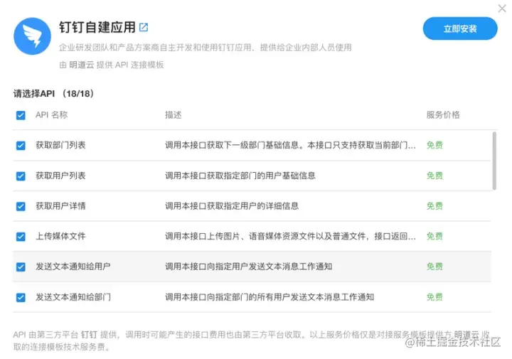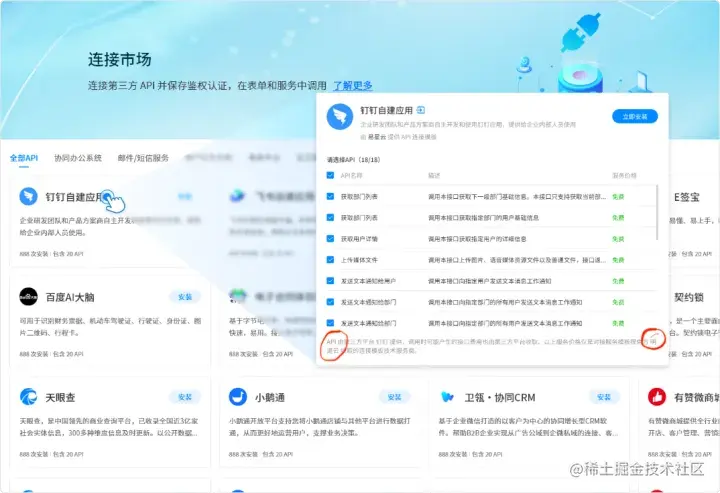 连钉钉自建应用的API接口排列次序都一样。这也太巧了吧?遗憾的是,百密一疏,你们的截图上终于有一个“明道云”字样没有修改掉。它出现在钉钉接口列表窗口下方的一段灰色声明文字上。遗憾啊,否则我们真的以为你们复刻出了明道云的集成中心能力。