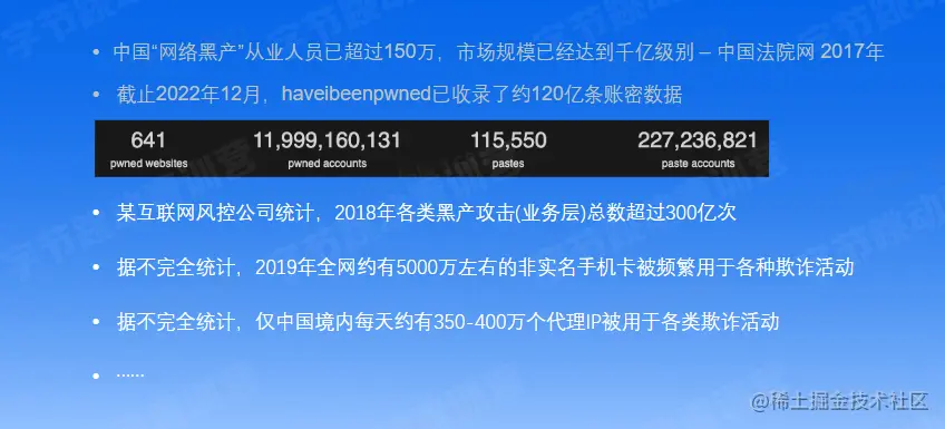 企业的信息安全体系是非常庞大的,任何一个环节都可能会出现安全风险。其中,黑灰产是安全人员最为关注的一个风险来源,也是历年来导致企业和用户损失最大的因素。