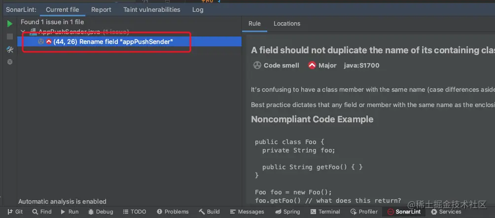 SonarLint 发现的问题后,会根据问题类型给出推荐的的范例代码协助开发人员找到合适的修改思路。