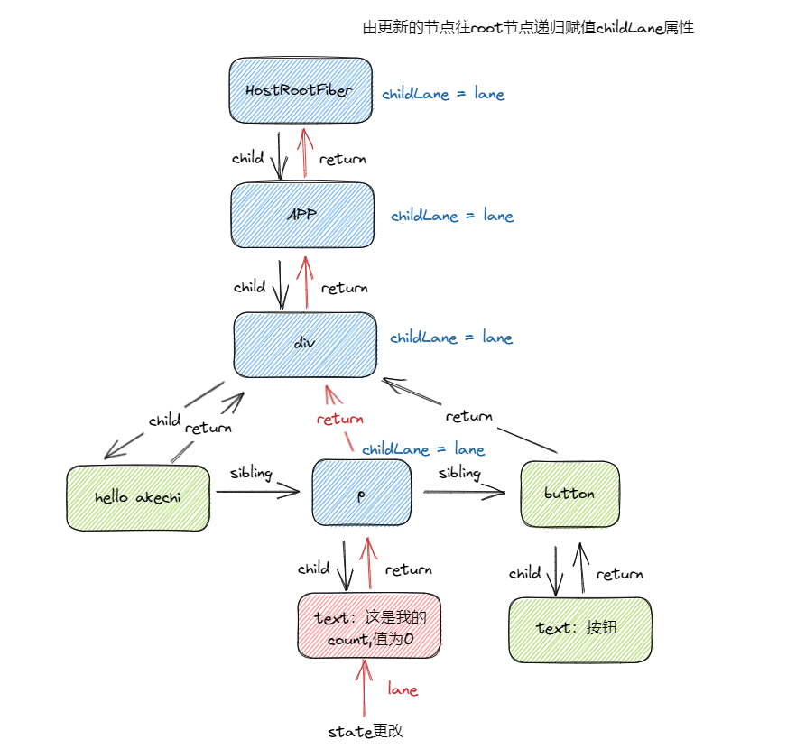 markUpdateLaneFromFiberToRoot方法,在fiber树中从更新节点递归向上标记此次的更新优先级,如果无更新退出函数