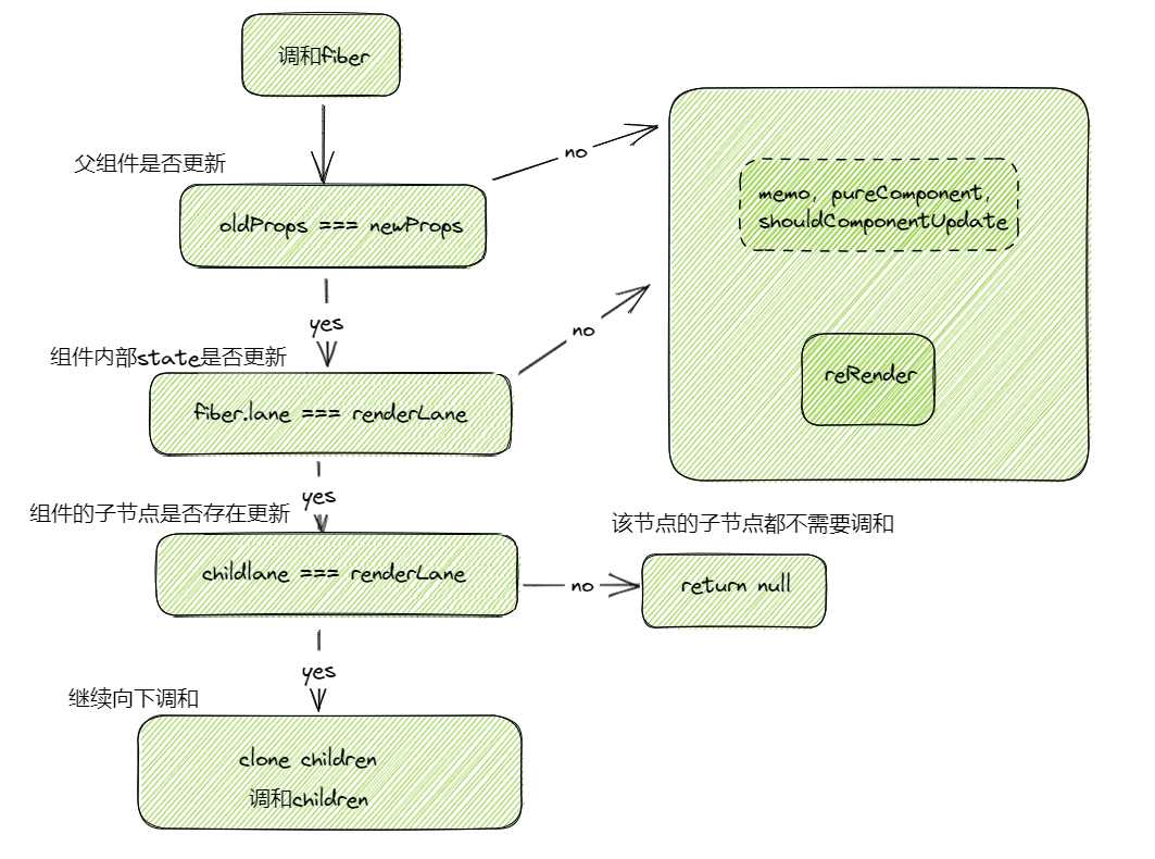 - 判断节点本身的childLane与renderLane是否相等,若相等则说明该fiber节点的子节点存在更新节点,继续向下调和;不相等说明该fiber节点的子节点不存在更新,不需要调和。