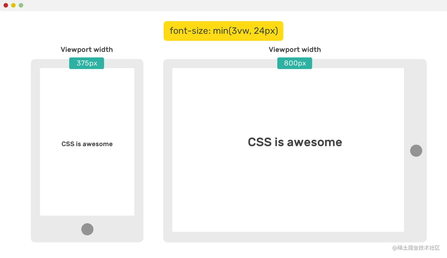 在移动视口中,字体很小。因此,不要只对字体大小使 min() 函数。当然,也可以通过媒体查询来取消或添加它。正如上面所说的,可以在 max() 函数中嵌套一个 min(),这将模拟clamp()函数: