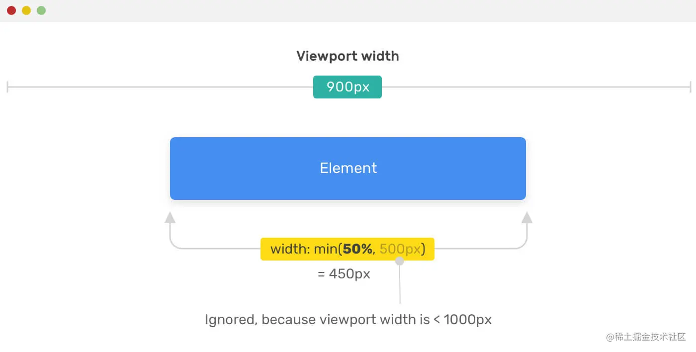 浏览器必须选择最小的值(50%,500px)。选择该选项取决于视口宽度。如果50%的计算值大于500px,那么它将被忽略,而使用500px。否则,如果50%的计算值小于500px,则50%将用作宽度值。视口宽度为1000px: