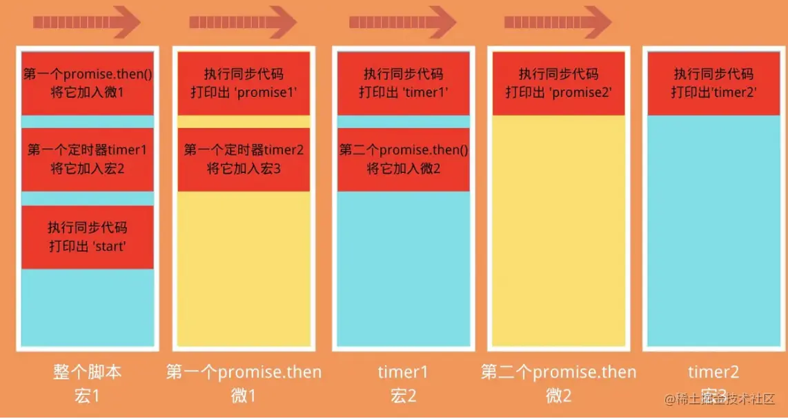 - 跳出promise,往下执行,碰到promise.then这个微任务,将其加入微任务队列