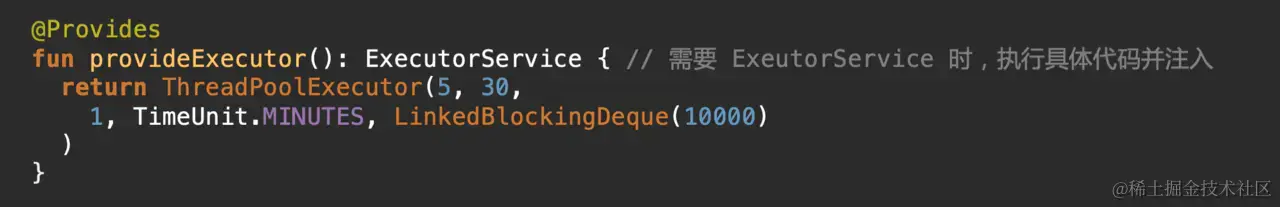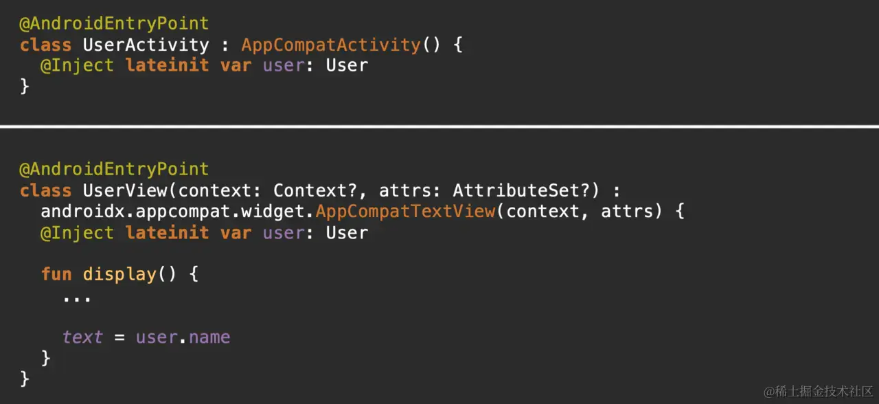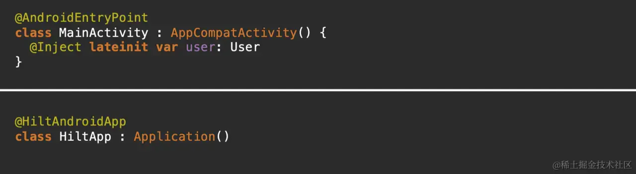 而如果用 Hilt,你可以把这个对象直接声明出来,让它自动注入: