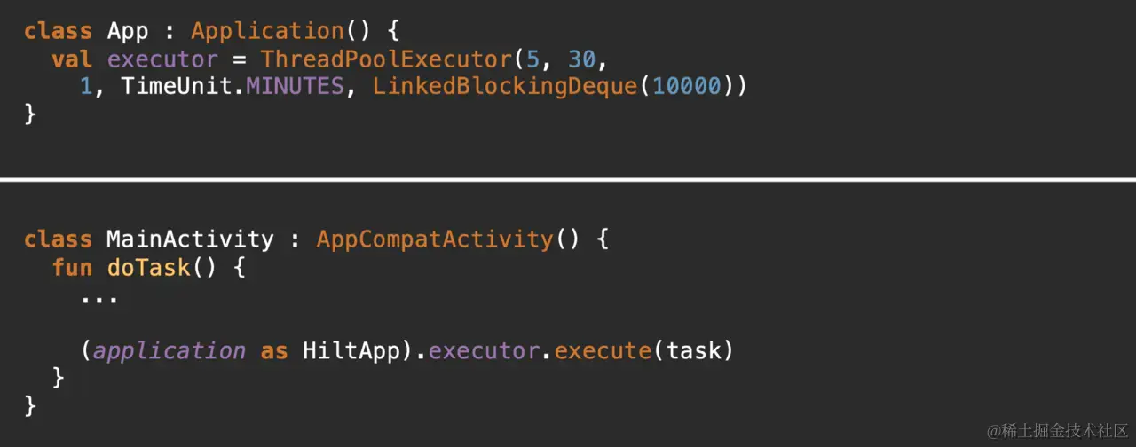 我们程序里有些对象是全局共享的,比如线程池,或者 Retrofit 对象,这种东西我们通常会把它放在 Application 对象里,或者做成单例的: