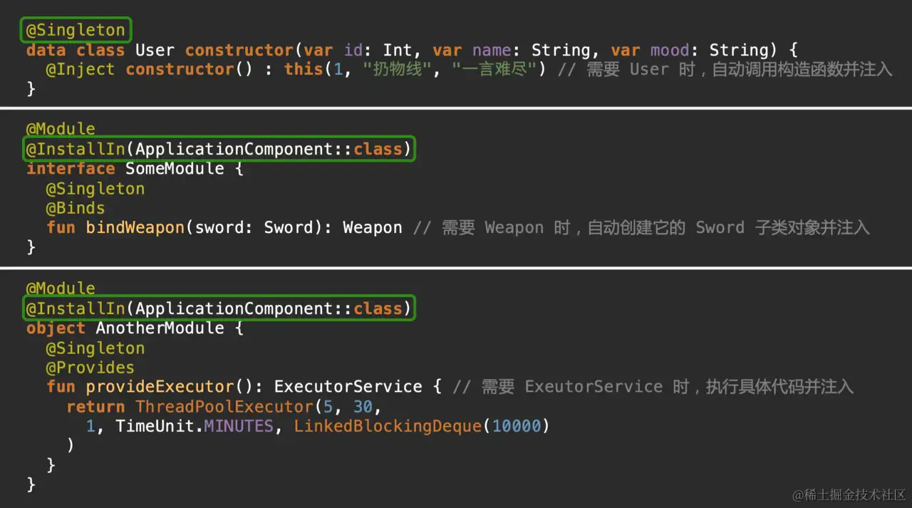 这些都属于由外部来提供依赖的初始化,所以都是依赖注入,并不是非要像 Dagger 那样使用注解的像魔法一样的才叫依赖注入。也就是说,其实我们每个人都已经在使用依赖注入了。虽然很多人在面对 Dagger 的时候会问「依赖注入到底有什么用」,但其实 Dagger 并不是提供了依赖注入的能力,而是为依赖注入提供了一种更简单的方式。依赖注入本来就是有用的,这个问题不想明白,不管是 Dagger 还是现在的 Hilt,你都用不好。