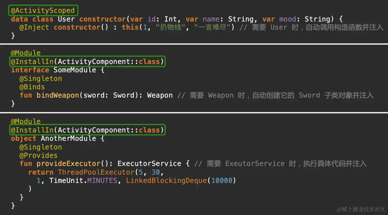 其实说白了,Dagger 的难用主要在于这个框架太强大和灵活了,导致你要遵守很多约定才能正确使用它。比如在 Hilt 里,一个注解就能让 Activity 内部的依赖自动被注入,而 Dagger 需要手动注入;再比如在 Hilt 里如果你想让一个对象只在 Activity 内部被共享而不是全局共享,也就是一个注解能解决的问题,而在 Dagger 里面你需要先去创建一个自定义的注解。这些难吗?每个都不难的,对吧?但把它们放在一起,让你灵活搭配使用,就有点难了。
