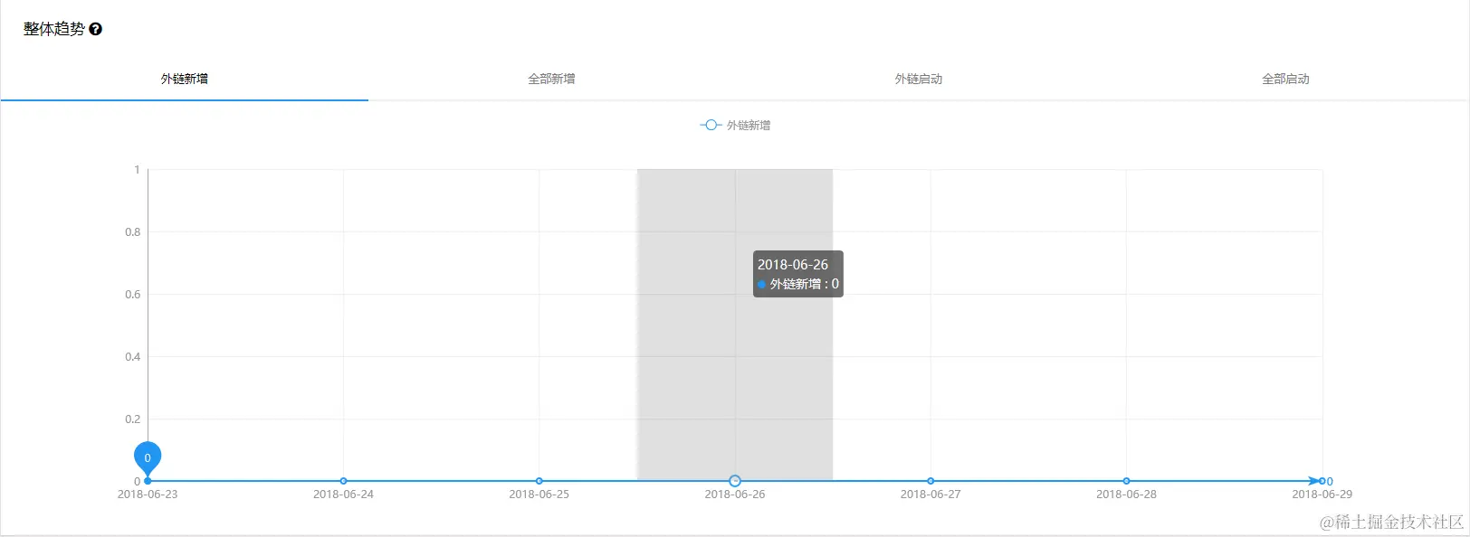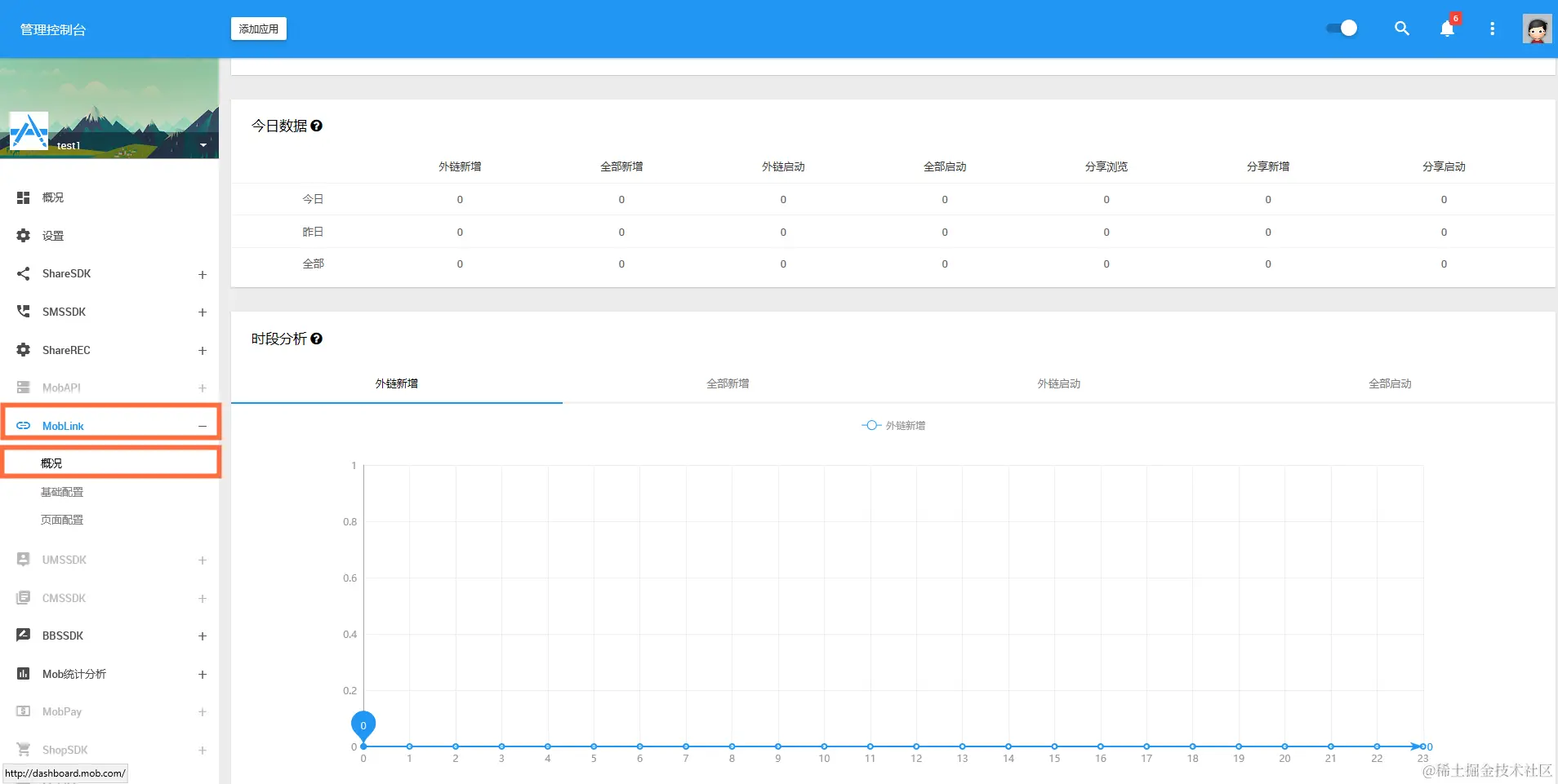 同样在后台的 MobLink 入口下,点击概况,就可以查看多项数据。包括近期每日的外链新增、全部新增、外链启动、全部启动、分享浏览、分享新增、分享启动等数据;和一天内分时段的各种数据