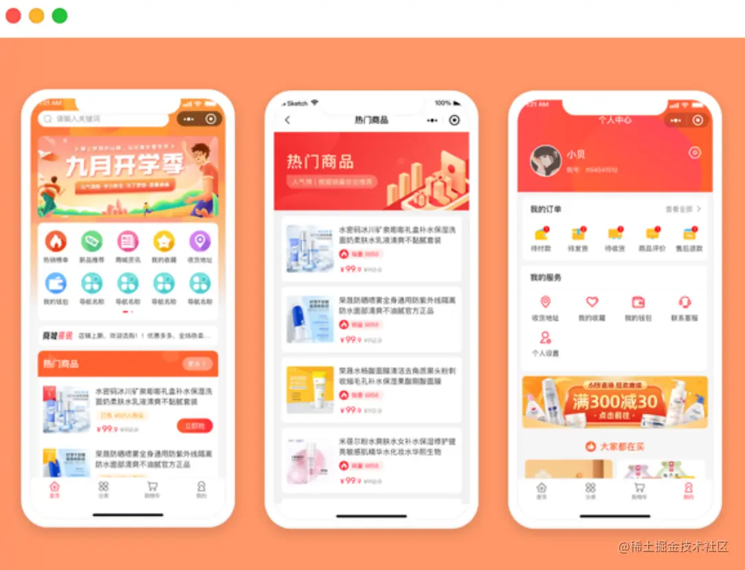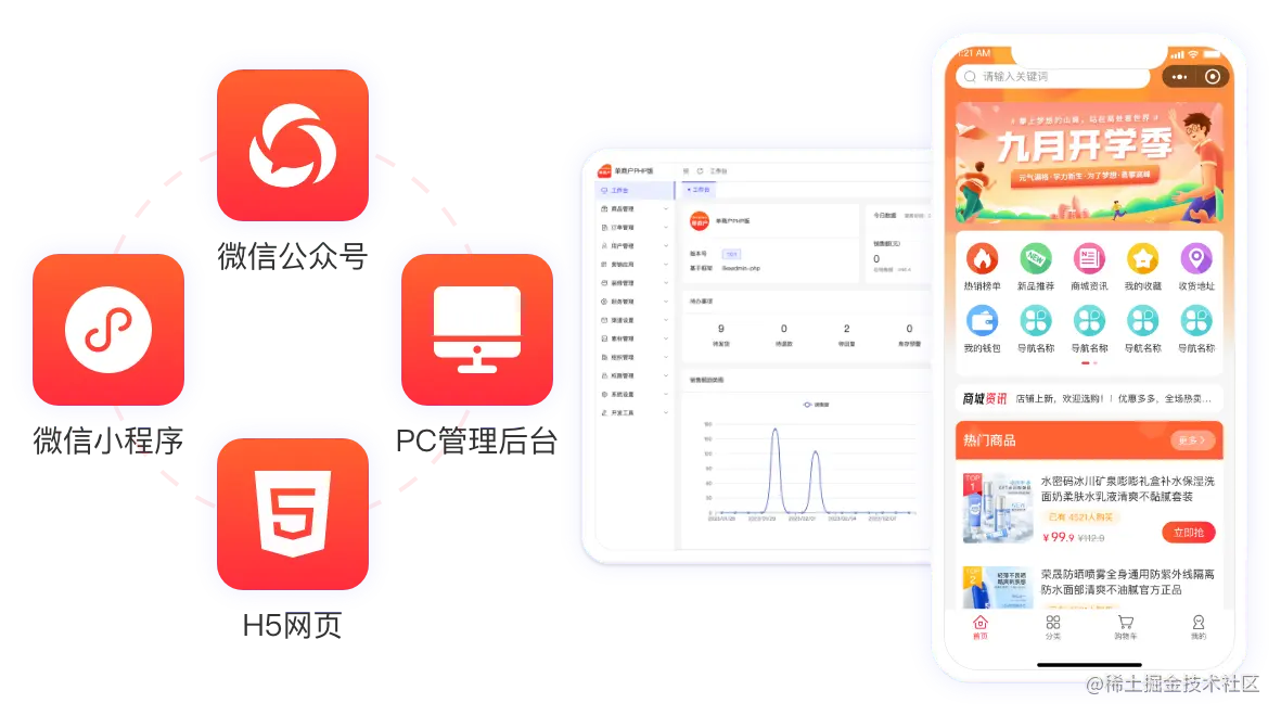 每个页面都精心设计,遵循统一的设计原则,可视化装修、商城资讯、热门商品、新品推荐