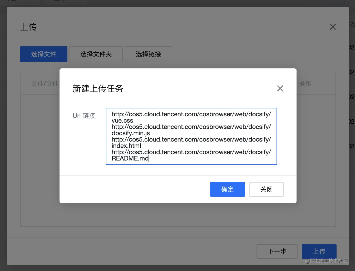 - 点击上传按钮,选择链接文件上传,并将下列 url 文件资源复制到输入框中,然后点击上传。