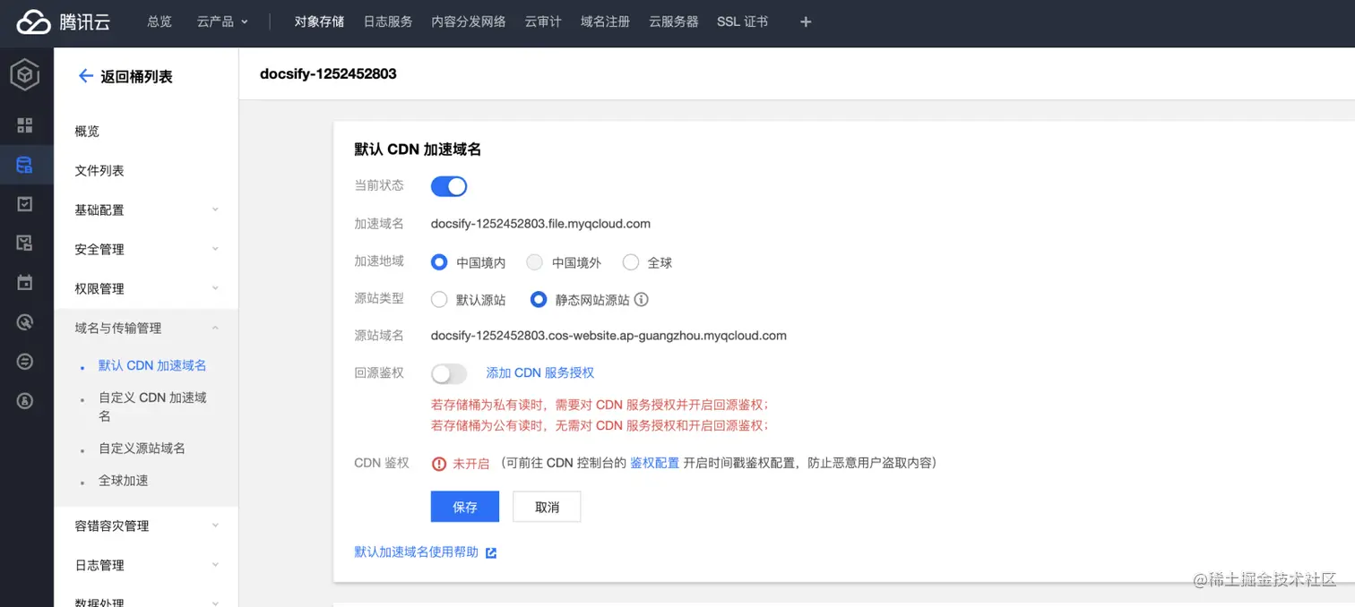打开COS 的默认 CDN 加速,源站类型选择静态网站源站。