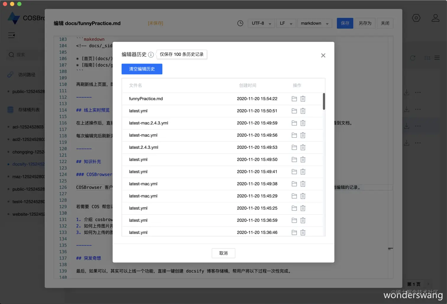 COSBrowser 客户端编辑窗口有一个小小的【时钟】按钮,点击该按钮可打开编辑器历史。但是该功能仅帮您保存最近 100 次所有文档编辑的记录。