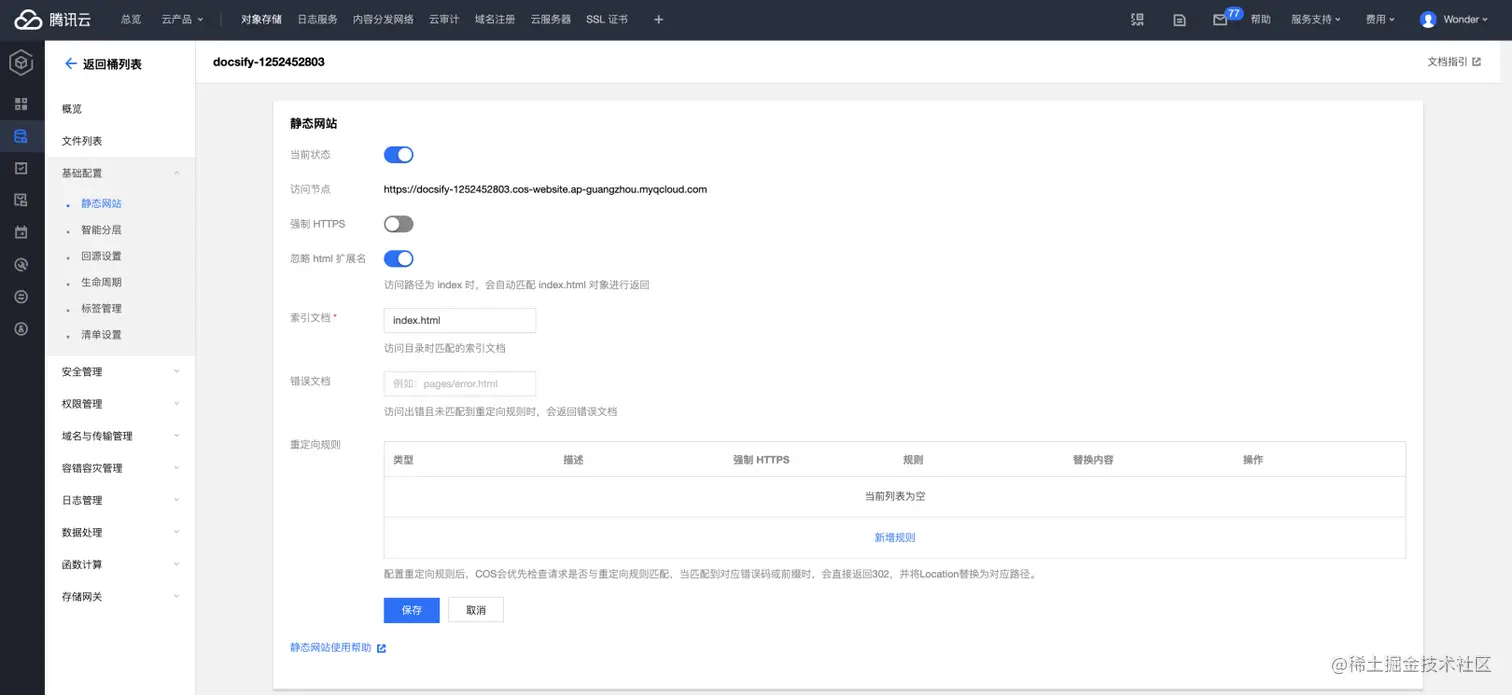打开 COS 的静态网站功能。