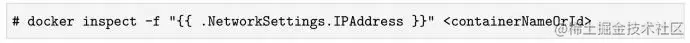 查看一个正在运行的容器被分配了什么IP地址,一般有两种方式:从外面看和从里面看。从外面看即使用docker inspect命令: