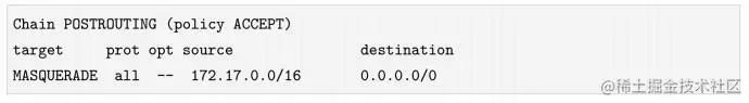 至于SNAT/MASQUERADE,Docker会在POSTROUTING链上自动创建规则: