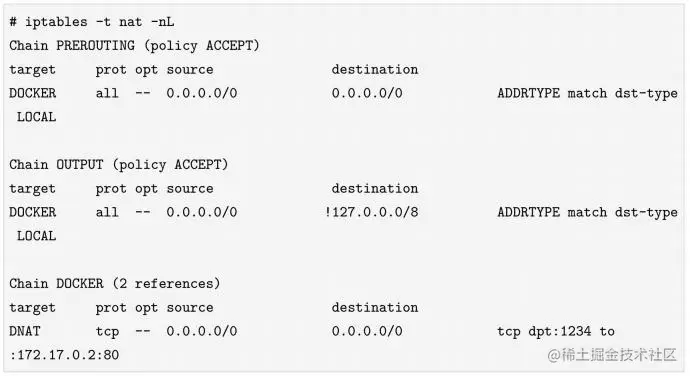 DNAT发生在DOCKER这条iptables链,它有两处引用,分别是PREROUTING链和OUTPUT链,意味着从外面发到本机和本地进程访问本机的1234端口的包目的地址都会被修改成172.17.0.2:80。