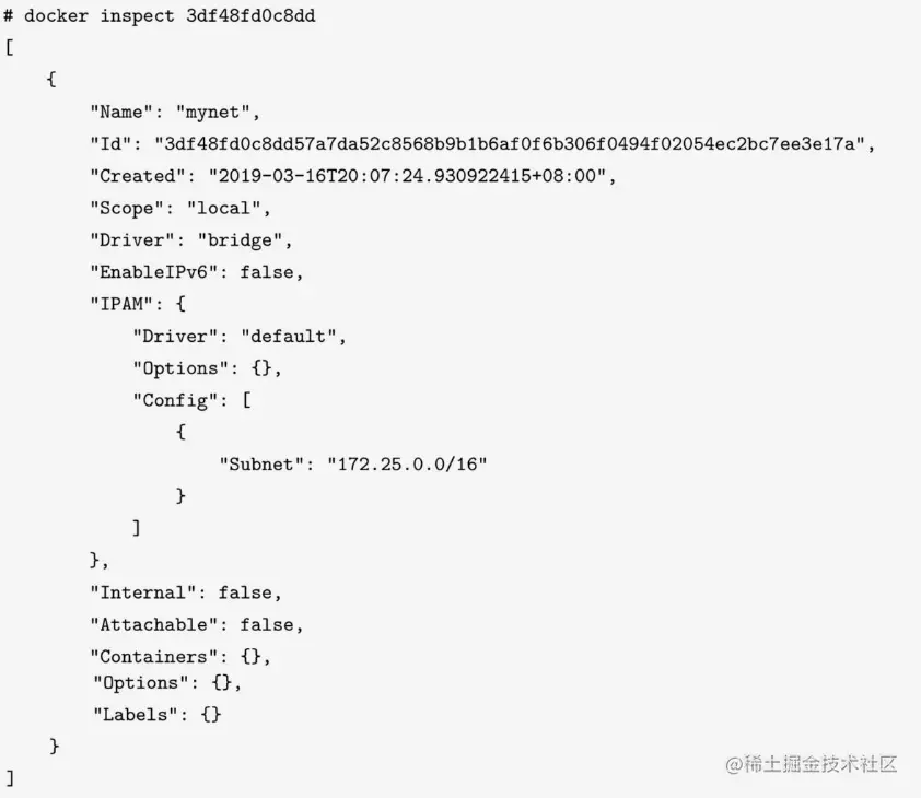 可以使用inspect命令查看某个网络的详细信息: