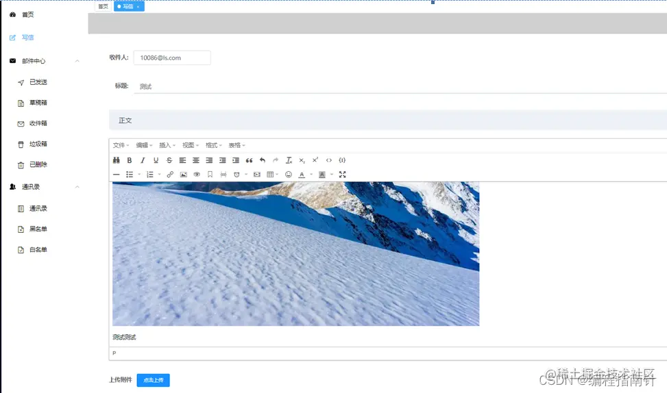 该页面通过前台首页的写信入口进入,集成了富文本编辑器插件。支持html标签、图片以及附件的上传等等,还能直接加入草稿箱、如下图6.3所示: