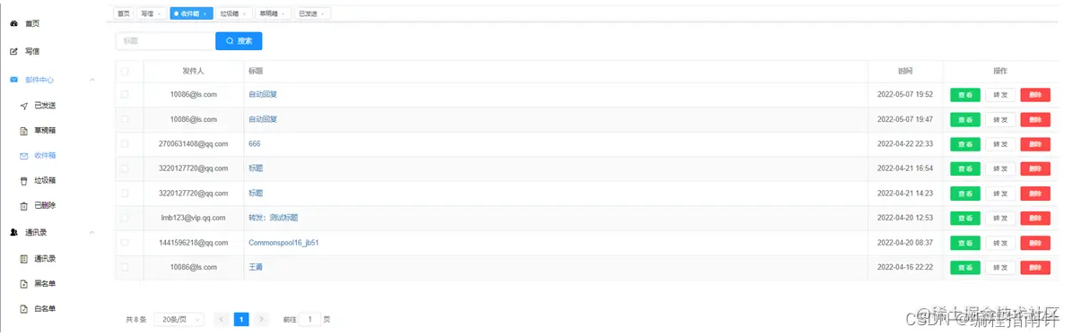 根据用户的id查询邮件,并且该邮件不是垃圾箱等状态,可以对该邮件进行查看、删除和转发。