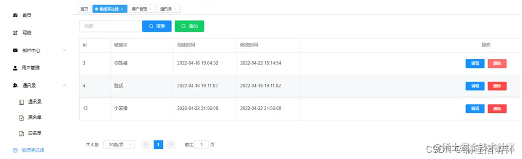 后台主要是管理员使用的,主要模块有用户管理以及敏感字词管理