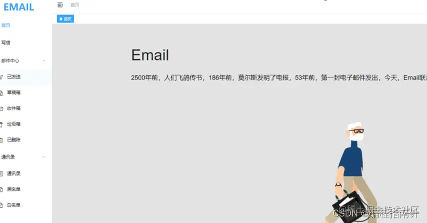 该页面通过用户输入正确的账号密码登录进来之后,映入眼帘的是一个我们邮件系统的动态logo,左侧是系统的主要功能,右上角则是用户的头像以及用户名,还支持网站国际化。如下图6.2所示: