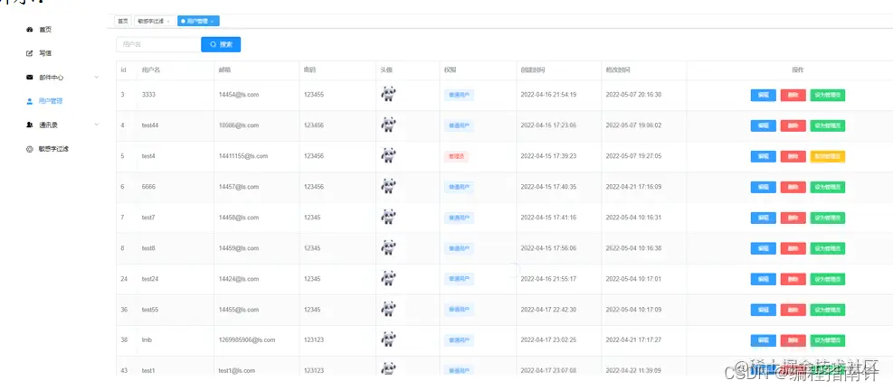 用户管理主要对反垃圾邮件系统所有用户的信息以等进行编辑,删除,以及对用户的权限进行修改,当设为管理员时就将该用户的字段中的roles加一个root,在前端vue的路由里面进行权限判断,数组里只有editor就是普通用户没有后台界面,里面有root的时候就是管理员,反垃圾邮件系统里面就有后台界面