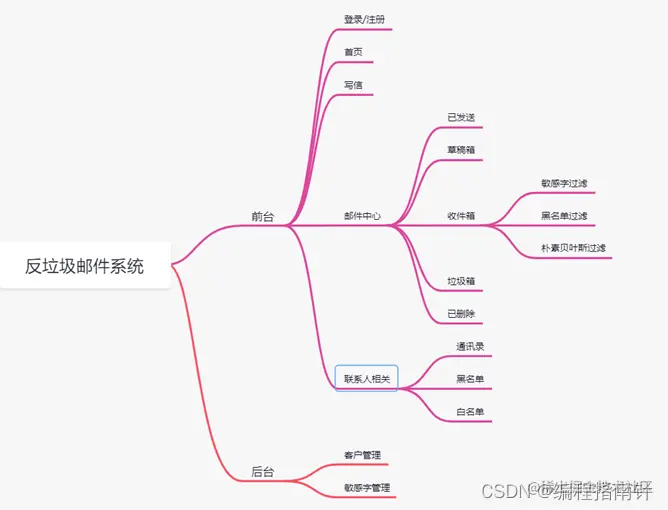 反垃圾邮件系统主要实现了前台(登录、注册、首页、写信、邮件中心(已发送、草稿箱、收件箱、垃圾箱已删除)、联系人相关(通讯录、黑名单、白名单)和后台(客户管理、敏感字词管理)。