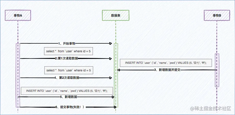 解决幻读了吗?显然没有,因为这个时候如果事务A执行一条插入操作