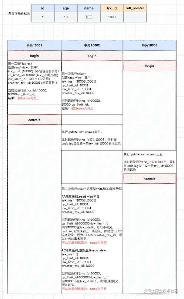 - trx_ids: 当前系统中那些活跃(未提交)的读写事务ID, 它数据结构为一个List。(重点注意:这里的trx_ids中的活跃事务,不包括当前事务自己和已提交的事务,这点非常重要)