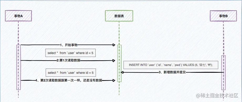 上面的文章是这样来举例说明,事务A第一次和第二次读到的是一样的,所以认为解决了幻读。我不认为这个是解决了幻读,而是解决了不可能重复读。它保证了第一次和第二次所读到的结果是一样的。