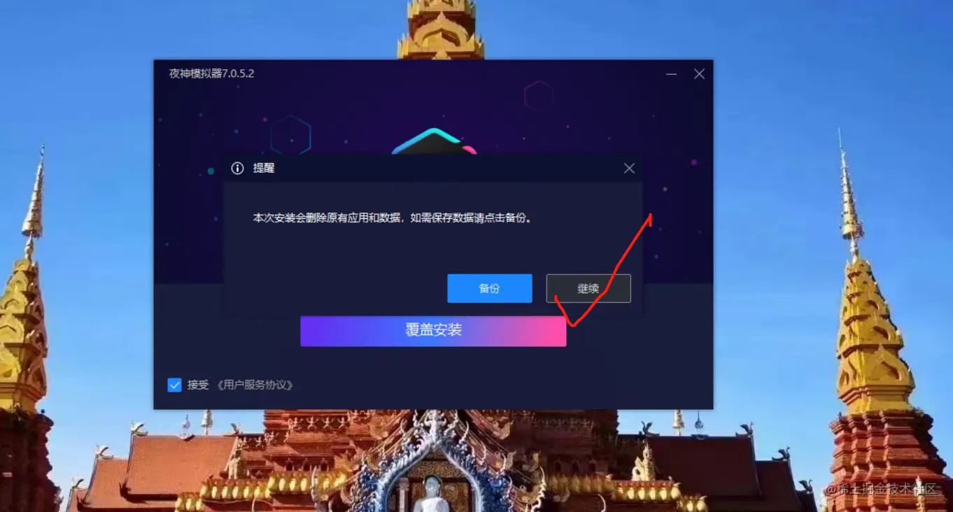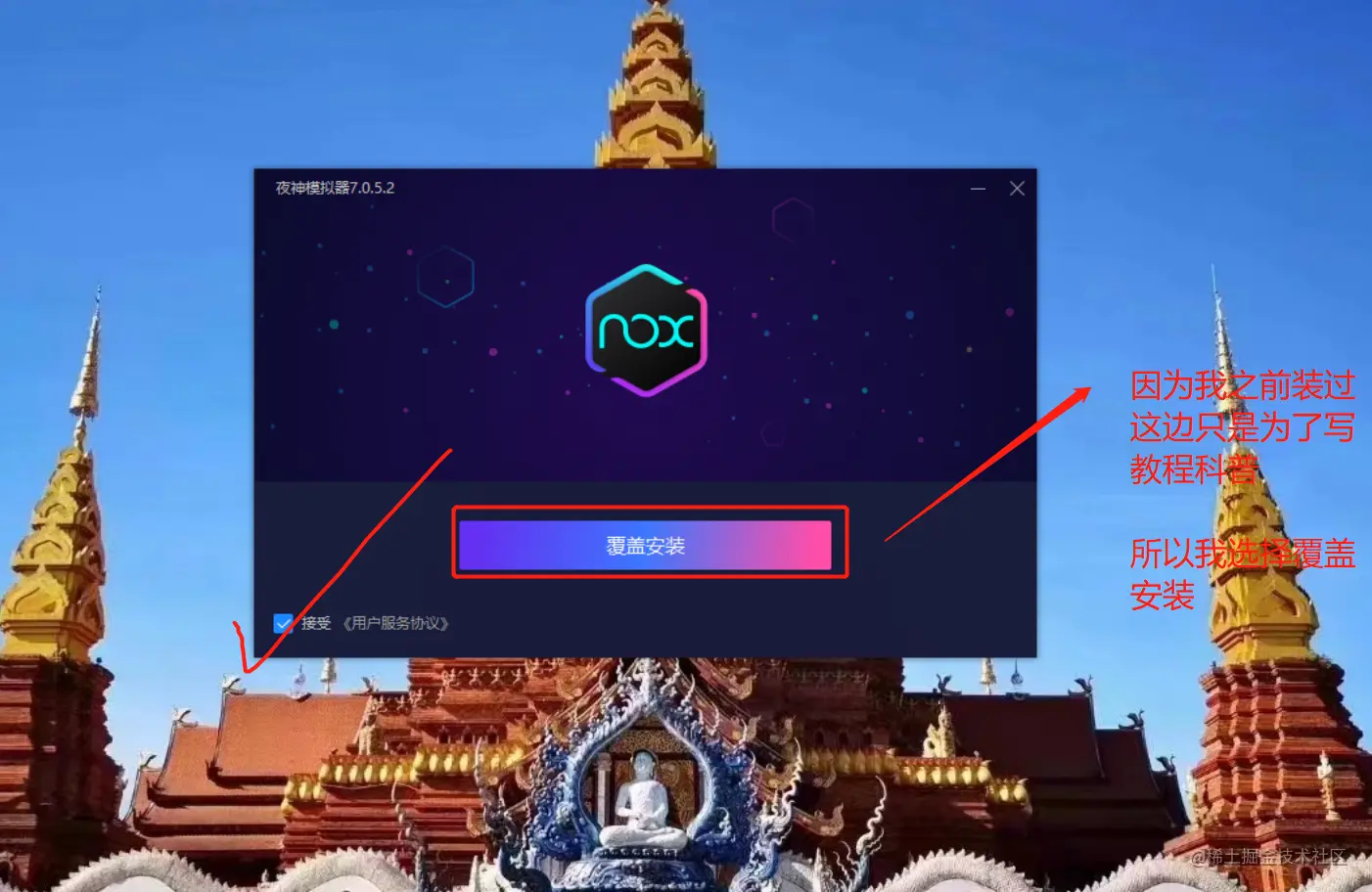 第四步:勾选同意用户服务协议,并点击覆盖安装,你们的话可能是立即安装