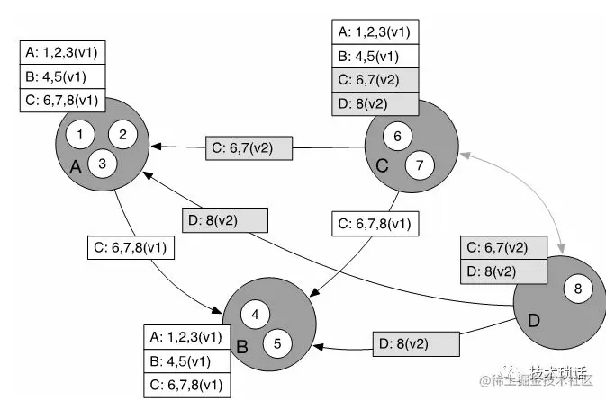D分担了C的某个hash桶,此时C/D和集群中其它节点就C所拥有哪些hash这件事发生了分歧:A/B认为C目前有6/7/8个hash桶。此时通过为gossip消息体引入版本号,使得关于C的最新状态信息(只有6/7两个桶了)在全集群达到一致。例如B收到来自A和C的gossip消息时会将版本号更新的消息(来自C的v2)更新到自己的本地副本中。