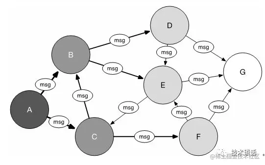 A节点率先知道了某个流言(msg),它首先将此信息传播到集群中的部分节点(比如相邻的两个节点)B和C,后者再将其传递到它们所选择的“部分”节点,例如B选择了D和E,C选择了将流言传播到B和F。以此类推,最终来自于A的这条流言在3轮交互后被传播到了集群中的所有节点。