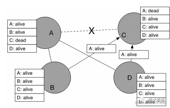 例如A和C的网络断开,但A和C本身都正常运行,此时A和C互相无法通信,C会将A标记为不可用状态。对于中心化思路的协议,如果C恰好是中心节点,那么A不可用的信息将会同步到集群的所有节点上,使得这些节点将其实可用的A也标记为宕机。而基于gossip这类去中心化的协议进行接收到消息后的实现逻辑扩展(例如只有当接收到大多数的节点关于A已经宕机的消息时,才更新A的状态),最终保证A不被误判为宕机。