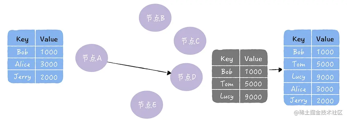 此时各个节点预先通过某种协议(比如Gossip)得知了集群的状态全集,此时新加入了节点D,如下图所示: