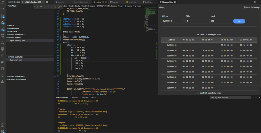 在调试功能增强方面,新版本DevEco Device Tool新增了内存断点、全局变量实时监控功能,支持添加三种类型的数据断点,分别为读断点、写断点、读或写断点,支持实时监控全局变量,支持值在二进制、十进制、十六进制间转换,默认为十进制。