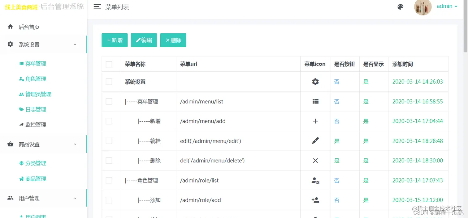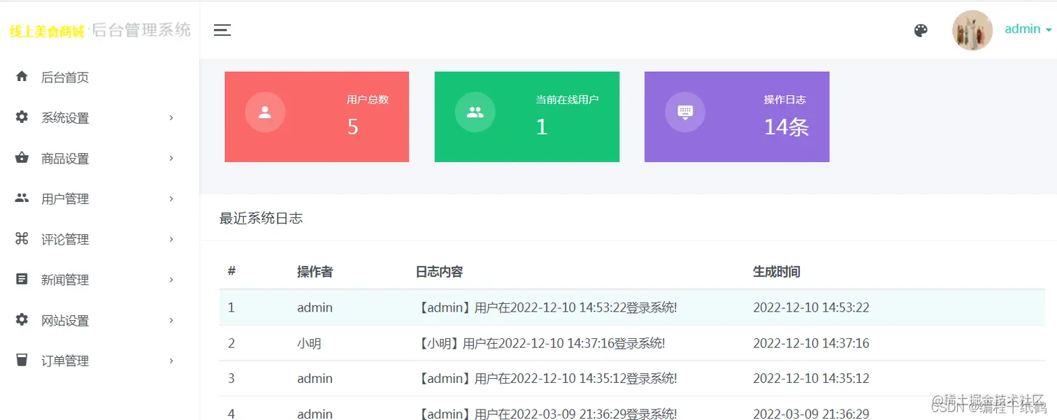 管理员用户登陆系统后台,主要进行用户管理,商品类型管理,商品管理,订单管理,评论管理,系统管理,角色管理,权限管理,日志管理等相关功能模块。