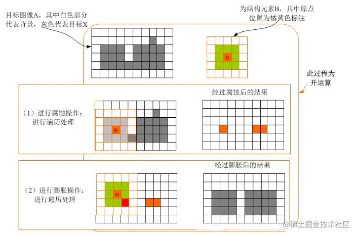 换句话说,A被B开运算就是A被B腐蚀后的结果再被B膨胀。图像开运算在OpenCV中主要使用函数morphologyEx(),它是形态学扩展的一组函数,其函数原型如下: