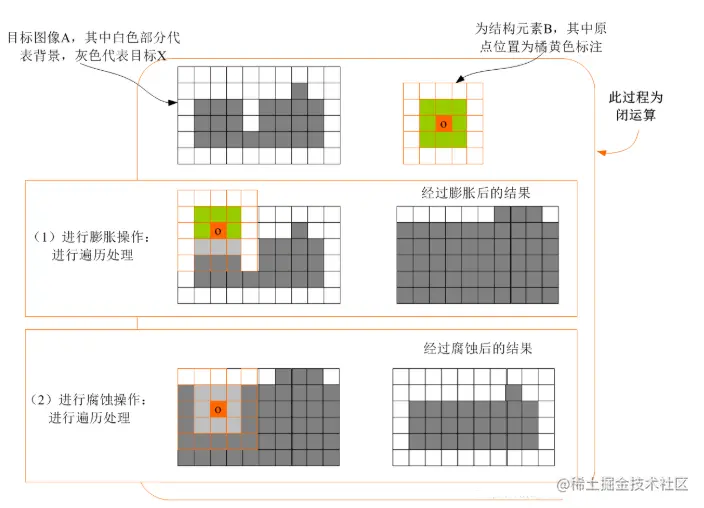 换句话说,A被B闭运算就是A被B膨胀后的结果再被B腐蚀。图像开运算在OpenCV中主要使用函数morphologyEx(),其函数原型如下: