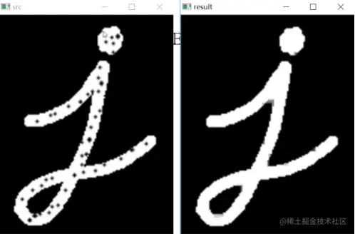 输出结果如图2所示,左边为原始图像,右边为处理后的图像,可以看到原始图形中的噪声点被去除了部分。
